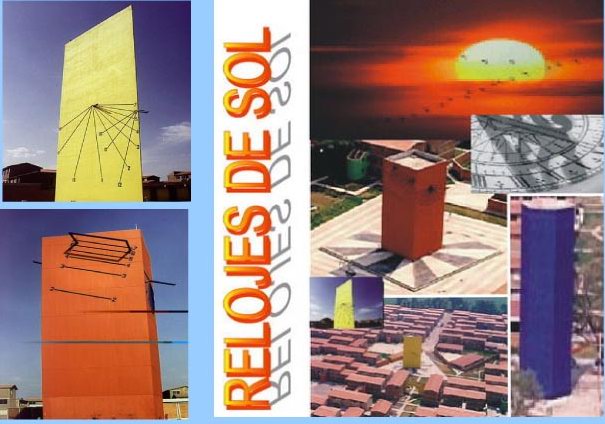 relojes de sol monumentales con diferentes geometrías: cuadrada, triangular,
